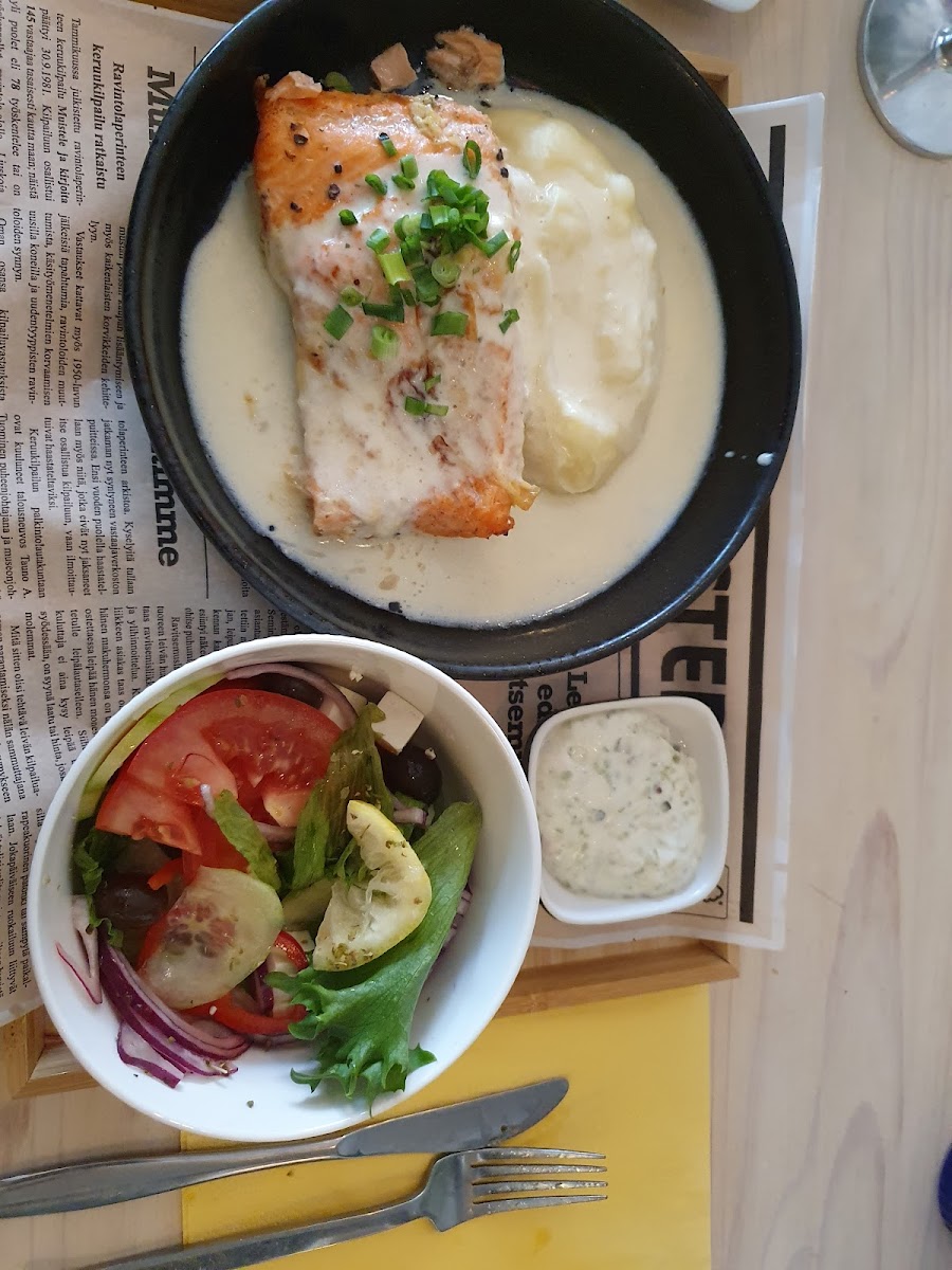 The café's menu features a variety of tempting culinary options, with an emphasis on fresh and flavorful dishes. Customers highly recommend the pizza buffet, with many noting the amazing pizza dough as a standout element of the experience. Alongside pizzas, you can savor a delicious lohian nosos salattilla (salmon dish with salad), which one satisfied customer described as "really good." For those with a sweet tooth, the dessert options—including a rich chocolate coffee mousse and a tantalizing lemon meringue—provide the perfect finish to your meal.